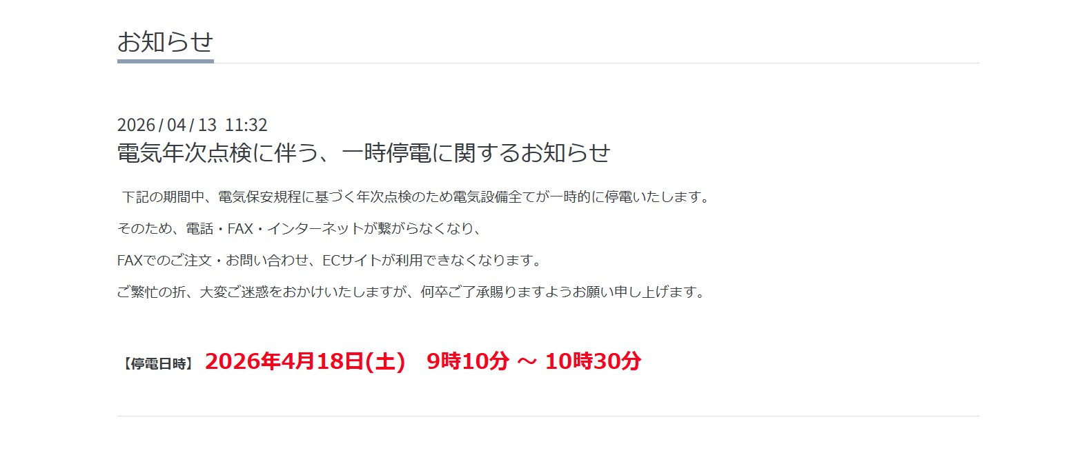 電気年次点検に伴う、一時停電に関するお知らせ -